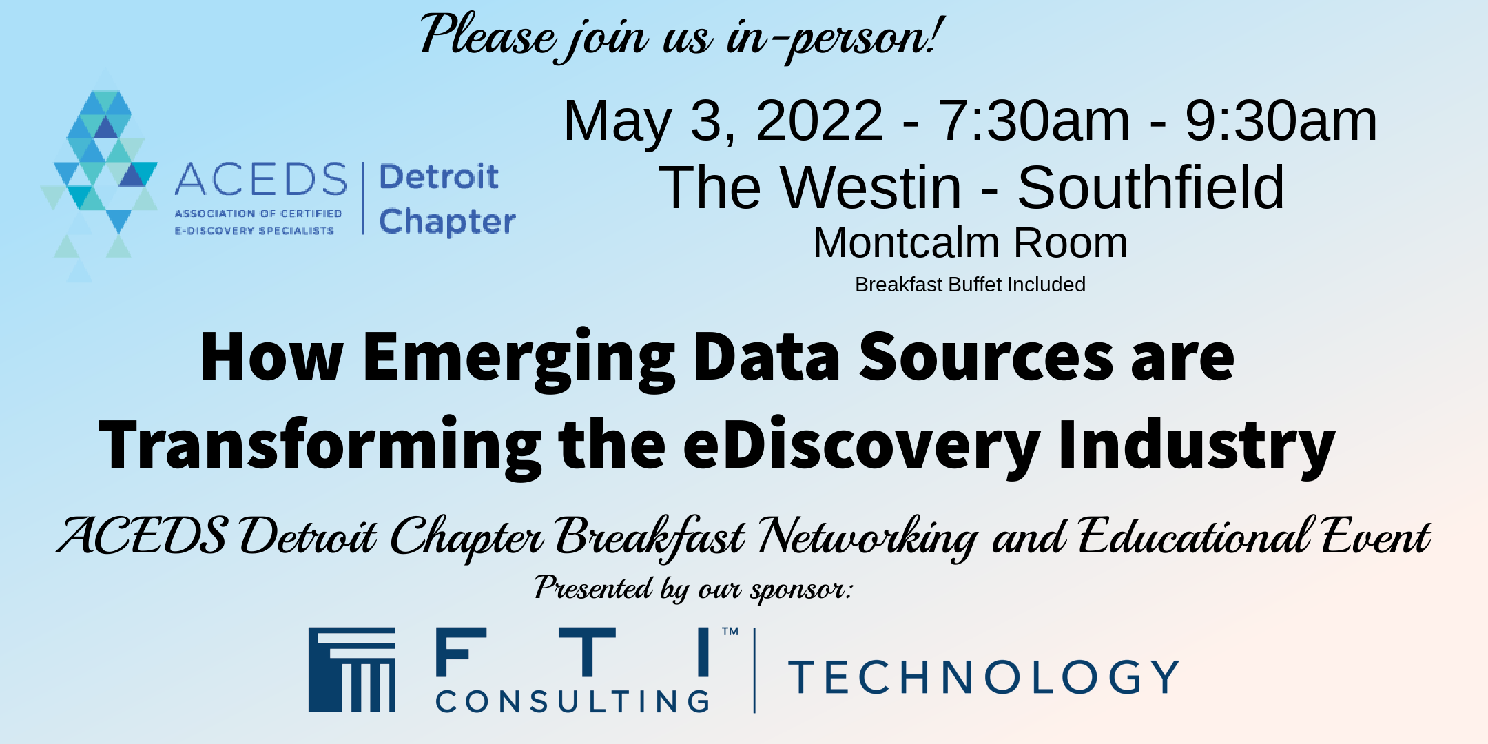 The Westin Southfield - Montcalm Room 1500 Town Center, Southfield, MI 48075, Southfield, MI, USACEDS Detroit Chapter Breakfast Networking and Educational EventThe sudden adoption of collaboration and communication platforms and the associated changes in our data topography will have permanent implications on the workflows, technologies and best practices used in eDiscovery. Join the ACEDS Detroit Chapter and FTI Consulting for a presentation on these emerging platforms and ways we […]